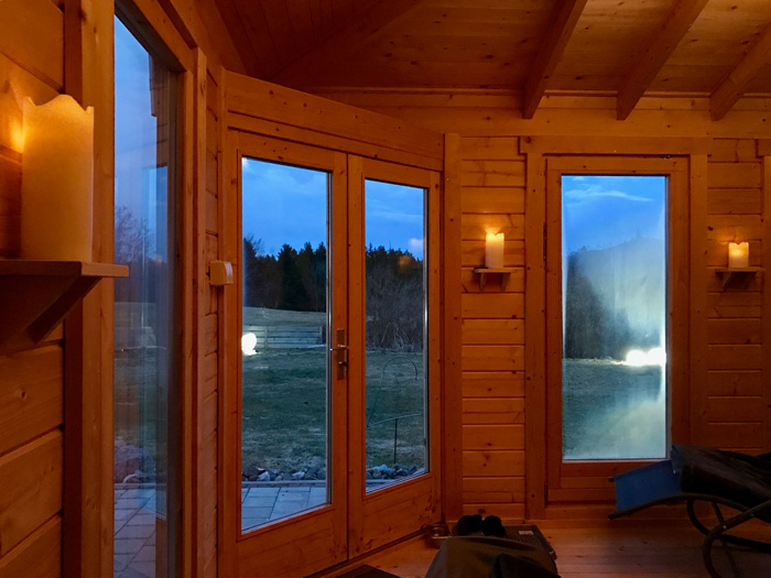 Seit 2016 haben wir eine Sauna im Garten die unsere Gäste gerne in den Wintermonaten kostenlos benutzen dürfen. Die Sauna beinhaltet einen Ruheraum für 2 Personen - der Zugang erfolgt über den Stadel. Die Vorheizzeit beträgt ca. 1 Stunde so dass Sie uns bitte rechtzeitig informieren.
